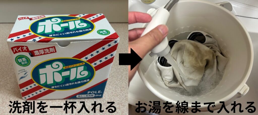 洗剤を一杯入れ、お湯を線まで入れます。
